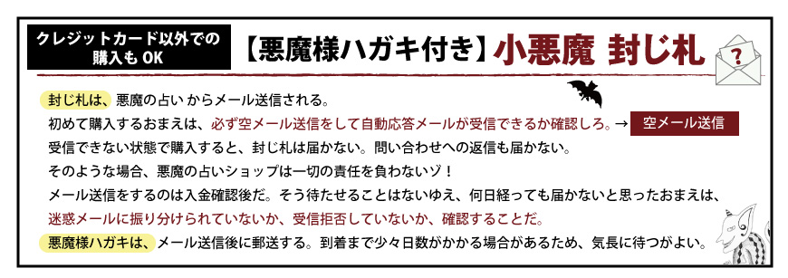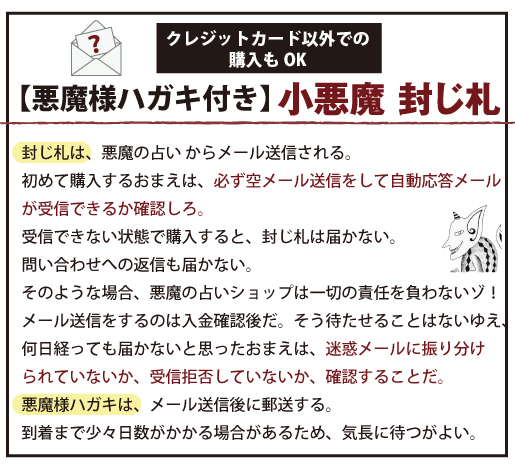 ■小悪魔封じ札は注文控えメールとは別に、 悪魔の占い から送信されます。